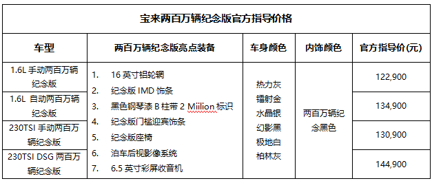 与此同时,为纪念宝来销售两百万辆,同时回报广大车主十六年来对宝来BORA品牌的厚爱,一汽-大众在宝来2017年型基础上,特别推出更具纪念价值、更具品牌荣耀的宝来两百万辆纪念版,以及更显运动个性、更物超所值的宝来运动版。两款宝来BORA品牌的新成员均增加了更有个性化的选装方案,更为实用、更具个性、更有价值,更好地满足消费者的多元需求。