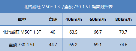 在噪音控制方面,我们分别测试了两款车在怠速,40公里/小时,60公里/小时以及80公里/小时。状态下的分贝值,北汽威旺M50F优势比较明显。