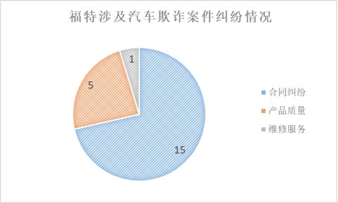 在统计到的451件汽车欺诈案件中,福特涉及汽车欺诈21件,占比4.66%,其中构成欺诈16件,占比76.19%;不构成欺诈5件,占比23.81%。涉及合同纠纷15件,产品质量5件,维修服务1件。涉及欺诈问题主要是被开具过发票,购买保险上过临时车牌,存在质量问题,将旧车作为新车出售,车辆已进行首次保养,旧车,更换车辆电瓶,雨刮器存在一定缺陷,召回车辆,质损车,存在交易记录、运输过车中发生损坏等问题。其中涉及涉及质损车1件,库存车2件,召回车辆3件。