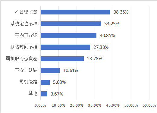调查结果显示,消费者选择网约车时,最担心遇到“司机绕路”(46.90%)和“司机服务态度差”(43.51%)等服务提供者的道德风险。在实际消费中,消费者最常遇到的是“不合理收费”(38.35%)和“系统定位不准”(33.25%)等运营层面问题。