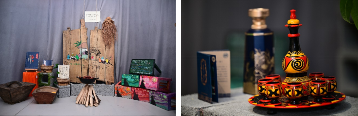 中国人的餐桌上,少不了酒。这次展览中的彝族酒具也为小小的几平米空间中增添了一抹民族风元素:红色、黑色、黄色相间,彝族的图案,立在中间的酒壶,围在旁边的一圈酒杯,“这是彝族同胞对餐桌的表达,也是让世界认识彝族厨房百态的载体。”李锦记希望厨师沙贵发来自四川凉山彝族自治州,是一名地地道道的彝族小伙子,作为此次展览的讲解志愿者,他也向公众科普了关于彝族厨房的故事。