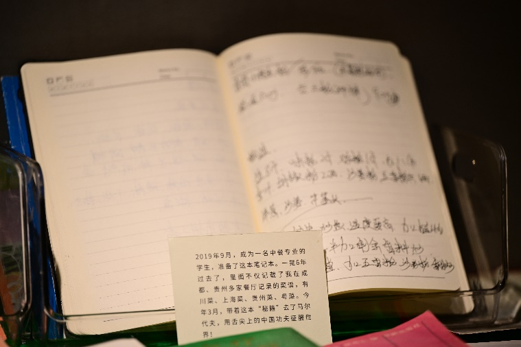在一众泛黄的旧时菜谱书籍中,两本字迹潦草青涩的笔记本和一张录取通知书显得格外醒目:笔记本的主人是李锦记希望厨师刘魏松,来自乐山的他在2019年成为一名李锦记希望厨师,笔记本中记录了他在成都财贸职高学厨期间的川菜菜谱,也记录了他先后在四川、贵州等地学习到的上海菜、粤菜、贵州菜的各种做法及心得。如今,已是马尔代夫娇丽酒店厨师的他,也在笔记本上增添了南亚菜的内容,真正实现了他入学时立下的目标“行万里路,读万卷书,做万千菜”。