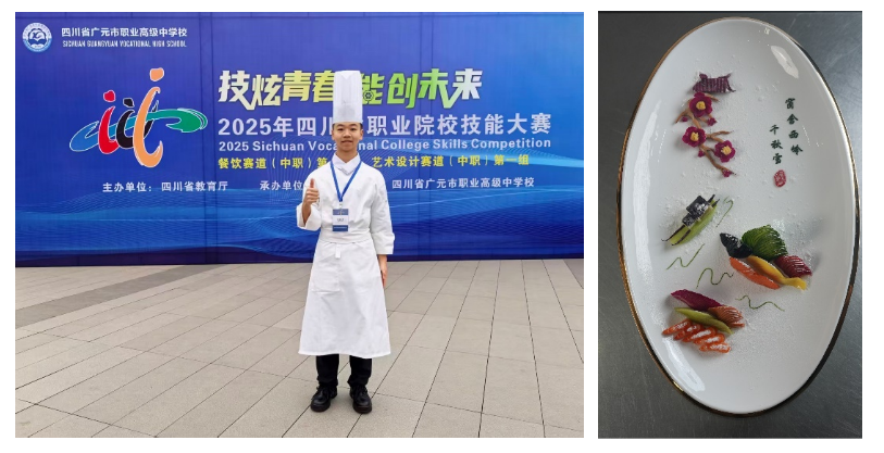 贺家林的家乡在江西省萍乡市莲花县,2024年成为李锦记希望厨师入读成都财贸职高,因为具有绘画天赋,他在食品雕刻和冷拼作品呈现上的能力脱颖而出,辅以平日的勤学苦练,多次参加校内外活动提升自我技能水平,并代表学校参加2025年度成都市中职学生技能大赛,获得团队二等奖。这次他负责的是冷拼作品《踏雪寻梅》,“这道菜的清鲜咸香味型,适配小雪节气赏雪寻梅雅趣,创意源自“窗含西岭千秋雪”,以全可食食材,用精准刀工塑造积雪、雪山的视觉效果,搭配梅枝、亭台雅致造型,还原诗意意境。”