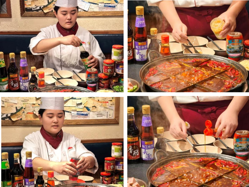 只见李锦记希望厨师陈馨霖动作娴熟地将李锦记薄盐生抽、味极鲜、旧庄蚝油等酱料分别舀至不同的碗中,混合均匀,一番操作之下,就调制出了基础红油款、酸辣清爽款、酱香醇厚款、重辣过瘾款、鲜咸复合款、沙茶咸香款等6种不同风味的火锅蘸碟,“重庆火锅重油重辣,在蘸碟中加入李锦记薄盐生抽,既能提鲜,又能平衡辣度,想吃辣又担心太辣的朋友可以试试。”