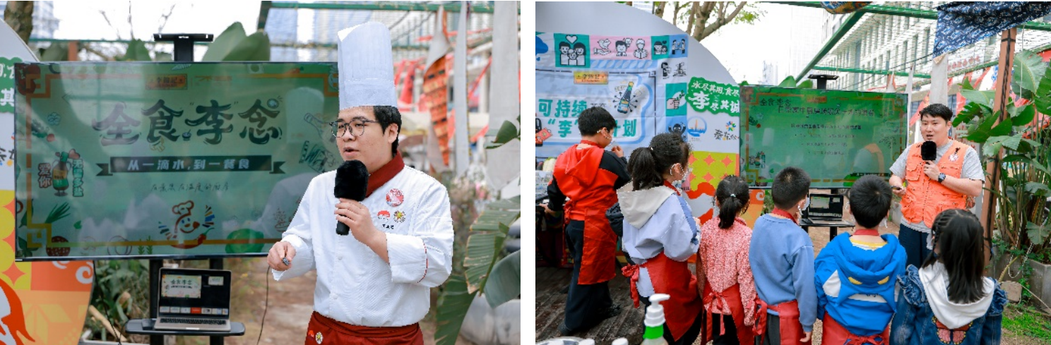 李锦记希望厨师王成浩(左)和志愿者向孩子们科普厨房中的水节约和全食概念