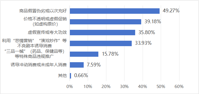 三是商品一致性、信息透明度与营销合规性仍是信任建设的薄弱环节。尽管整体满意度较高,但结构性矛盾依然存在。一是“货不对板”问题较为突出,“商品描述与实际收到商品的一致性”在七个评价维度中满意率最低(非常满意仅51.35%),成为影响消费信任的主要问题;二是虚假与夸大宣传现象仍然存在,35.80%的消费者反映存在虚假宣传或夸大功效问题,49.27%的消费者认为“商品假冒伪劣或以次充好”是最突出问题。体验调查进一步证实,部分直播间存在使用绝对化用语(如“万能”)、违规宣传医疗功效(如普通食品宣传减肥、治疗)、通过遮挡规避审核等现象。三是营销套路诱导消费问题依然存在,利用悲情营销、演戏炒作诱导消费(33.93%)以及虚假“限时秒杀”等营造紧迫感的手法,仍是影响消费体验的重要因素。