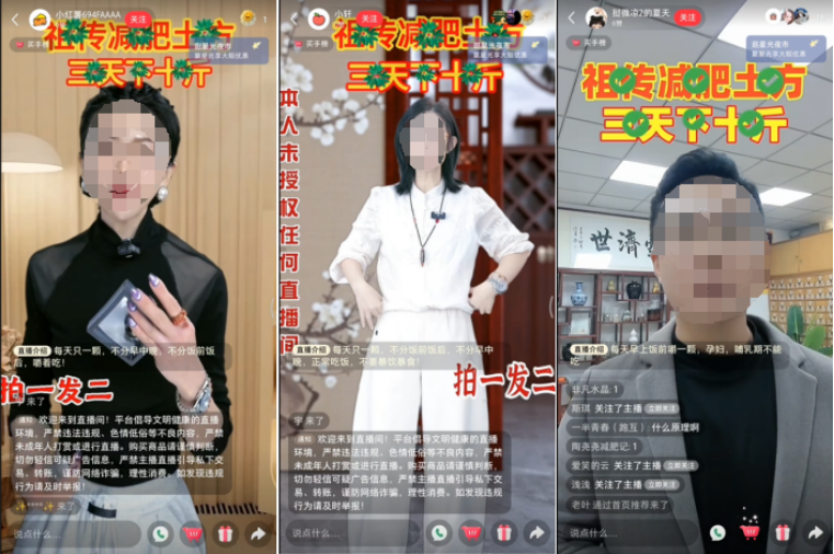 案例二:体验人员通过小红书“小红薯694FAAAA”直播间购买了一款植萃中草本萃取轻身丸,价格39.9元。直播间内以显著方式展示“祖传减肥土方 三天下十斤”两行大字,文字间做了部分遮挡处理,直播间入口处显示“本草瘦身,3天↓10斤,不满意全额包退”。直播过程中,主播声称该产品为纯果蔬植物成分,18岁至80岁均可食用(孕妇除外)。体验人员发现小红书平台“挝微凉2的夏天”“小轩”等直播间在销售同款产品,背景同样展示着经过遮挡处理的“祖传减肥土方 三天下十斤”字样。体验人员收到货后发现产品标注为“冷加工糕点”,收到短信“一周掉5—7斤”并让与其联系正确用法用量。