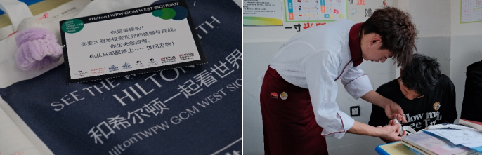 同样不是第一次回到凉山州参与公益活动的,还有来自凉山盐源县的蒙古族小伙子曹俊。上一次是去年10月,他跟着李锦记可持续“李”想计划回到凉山州,在川兴中学,为同学们带来一场关于可持续与航天的研学活动。 “正是那次的活动,我认识了在成都兴隆湖润扬希尔顿逸林酒店工作的学长,在他的邀请下,今年加入了酒店成为一名西餐厨师。”曹俊说,从凉山州到成都,从学校到希尔顿酒店,他看到了大山外的精彩世界“不仅有繁华,也有各种便利和机会。希望能有更多家乡的孩子能够看看大山以外的世界,不仅是用眼睛看,更能用心感受,用行动改变。”