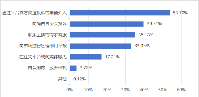 在消费纠纷解决方面,超半数(53.70%)受访者首选“通过平台官方渠道投诉或申请介入”,其次为“向消费者协会投诉”(39.71%)、“联系主播或商家客服”(35.18%)、“向市场监督管理部门举报”(33.05%)、“在社交平台或向媒体曝光”(17.21%),仅有3.72%的受访者选择“自认倒霉,放弃维权”。这说明消费者维权意识增强,平台内部渠道是维权主渠道。