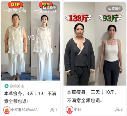 案例二:体验人员通过小红书“小红薯694FAAAA”直播间购买了一款植萃中草本萃取轻身丸,价格39.9元。直播间内以显著方式展示“祖传减肥土方 三天下十斤”两行大字,文字间做了部分遮挡处理,直播间入口处显示“本草瘦身,3天↓10斤,不满意全额包退”。直播过程中,主播声称该产品为纯果蔬植物成分,18岁至80岁均可食用(孕妇除外)体验人员发现小红书平台“挝微凉2的夏天”“小轩”等直播间在销售同款产品,背景同样展示着经过遮挡处理的“祖传减肥土方 三天下十斤”字样。体验人员收到货后发现产品标注为“冷加工糕点”,收到短信“一周掉5—7斤”并让与其联系正确用法用量。