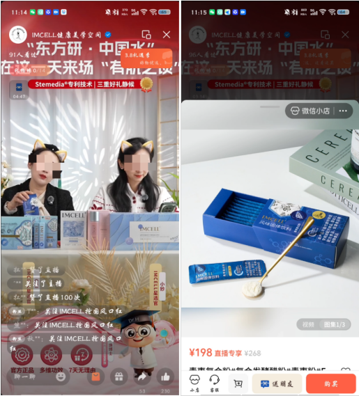 案例体验人员于2026年3月6日通过微信直播“IMCELL健康美学空间”直播间发现,该直播间在直播过程中宣传一款“青枣复合粉固体饮料”,主播宣称:“这个青枣粉里面它有青枣、符合发酵醋粉的专利技术,对于我们肝脏的酶的能力提升也是很有帮助的,对我们的小心肝就是一个非常好的保护”“它最好的一点就是让你的肝气梳顺”。该产品实际为风味固体饮料,却暗示具有保护肝脏、梳顺肝气等功效,涉嫌虚假宣传。