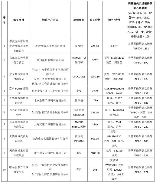 比较试验样品由北京市消费者协会组织工作人员以普通消费者身份通过网络购物平台购买,涉及京东商城、天猫、亚马逊、当当网、苏宁易购、1号店、唯品会、聚美优品、梦芭莎等网站销售的40个品牌的羊绒衫样品,购买价格376元至8588元不等。