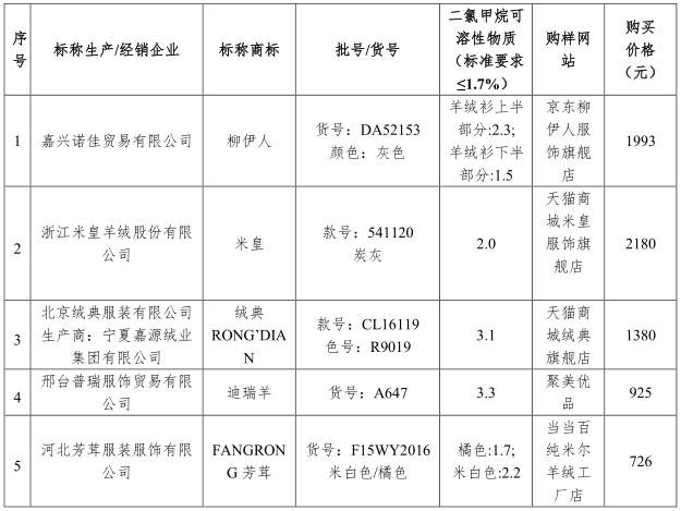 二氯甲烷可溶性物质是指用二氯甲烷作为萃取溶剂测定羊绒衫中油脂等可溶性物质的含量,它包括天然羊毛油脂,生产工序中加上的油剂、洗涤剂、特殊处理方法所用的整理剂如柔软剂等。二氯甲烷可溶性物质超过国家标准要求说明该羊绒衫含油脂过高或后整理时添加了过多的整理剂,会使皮肤敏感的消费者造成嗅觉或体感上的不适。经测试,本次比较试验的40件样品中有5件样品该指标不符合国家标准要求,它们是:
